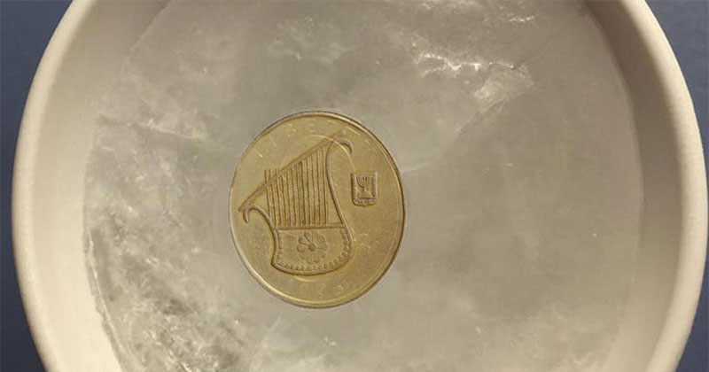 - לאחר שכל המים בכוס קפאו לחלוטין, שימו את המטבע בתוך הכוס על הקרח ותחזירו את הכוס למקפיא.