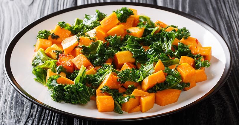 כעת, בזמן שהירקות נאפים בתנור, תאדו את הקינואה ותשימו את הקייל בתוך סיר על הגז, תשפכו מעל מים רותחים בכמות שתכסה אותו ולא יותר. תדליקו את האש ותתנו לקייל לרתוח במשך 2-3 דקות, תכבו את האש, תעבירו את הקייל למסננת ותשטפו אותו עם מעט מים קרים. כדי לעצור את המשך הבישול. עכשיו תחתכו את הפטרוזיליה או הכוסברה (על פי טעמכם), אתם לא חייבים לקצוץ אותם דק.